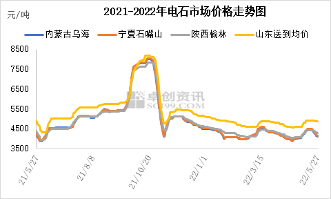 5月份西北地区电石开工前低后高,中旬开始陆续恢复,至月底电石行业平均开工负荷率已提升了3个多百分点。同时需求量前高后低,在此影响下,电石企业上半月货源紧张,价格连续上涨,下半月陆续下行,最终价格重心较上月底提升了100元/吨左右。截至5月27日各地电石出厂价:内蒙古乌海地区电石贸易出厂价4100元/吨;宁夏石嘴山地区电石主流出厂价4100-4150元/吨;陕西地区出厂价格4100-4420元/吨,含固定下游客户折合出厂价;甘肃地区主流4200-4300元/吨,主要为固定下游客户折合出厂价。
